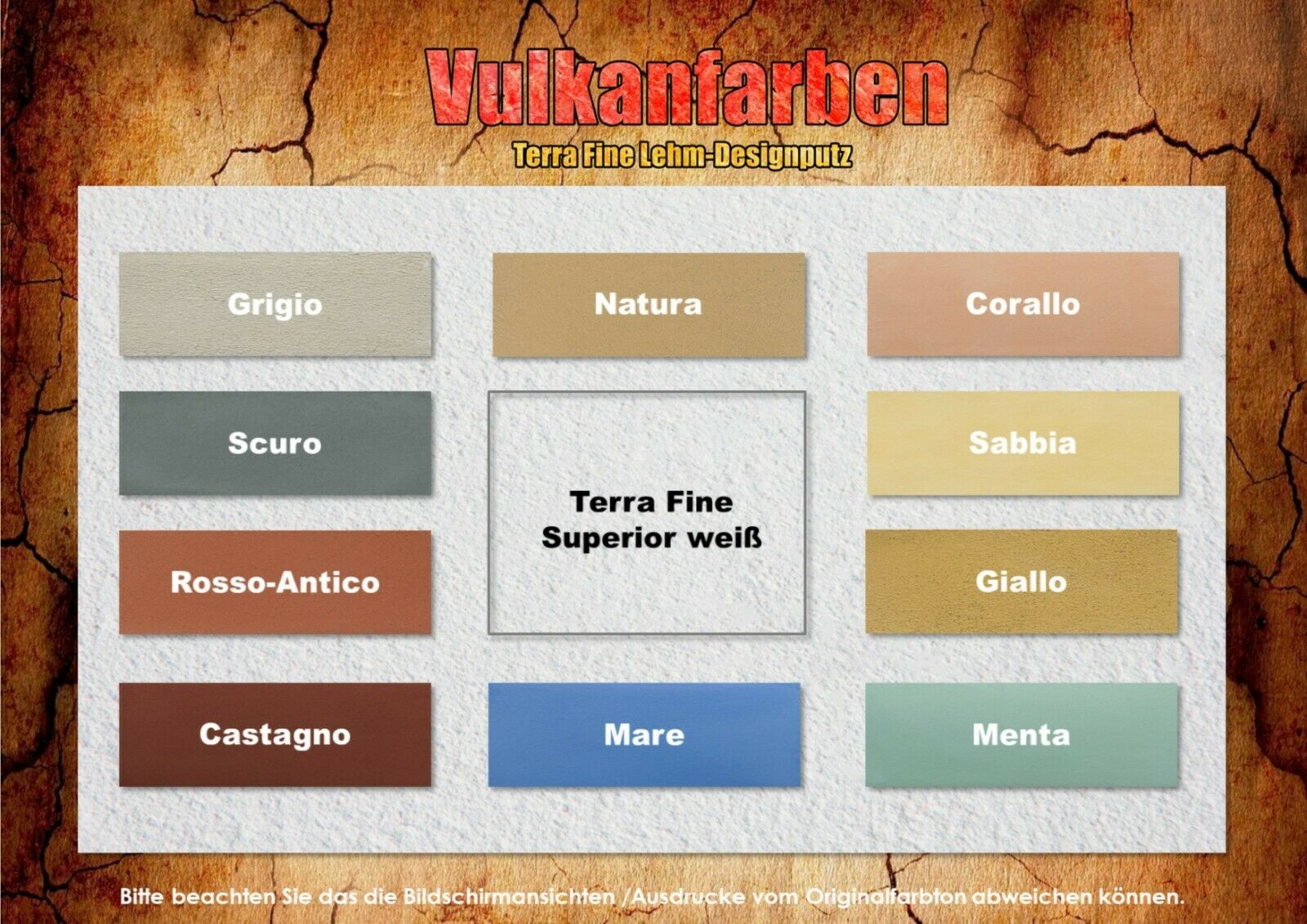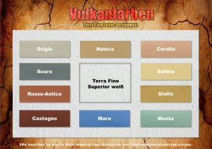 Terra Fine besteht aus ausgesuchten farbigen Tonmehlen, feinem Kalksand und Cellulosen. Terra Fine ist frei von Kunststoffzusätzen und Konservierungsmitteln. An Stelle von günstigem Quarzsand enthält Terra Fine feinen Kalksand. Dieser ist im Gegensatz zum Quarz wasseraufnahmefähig.